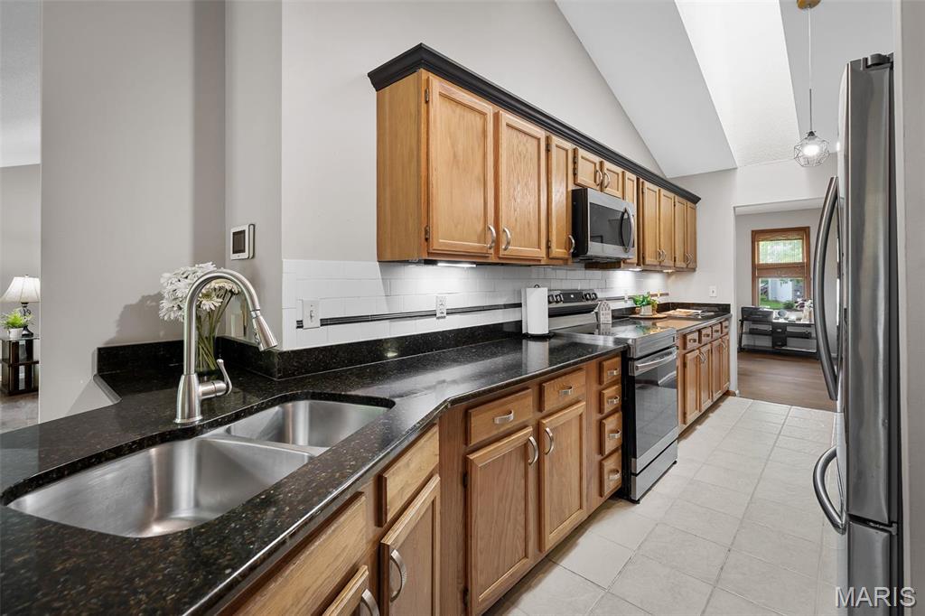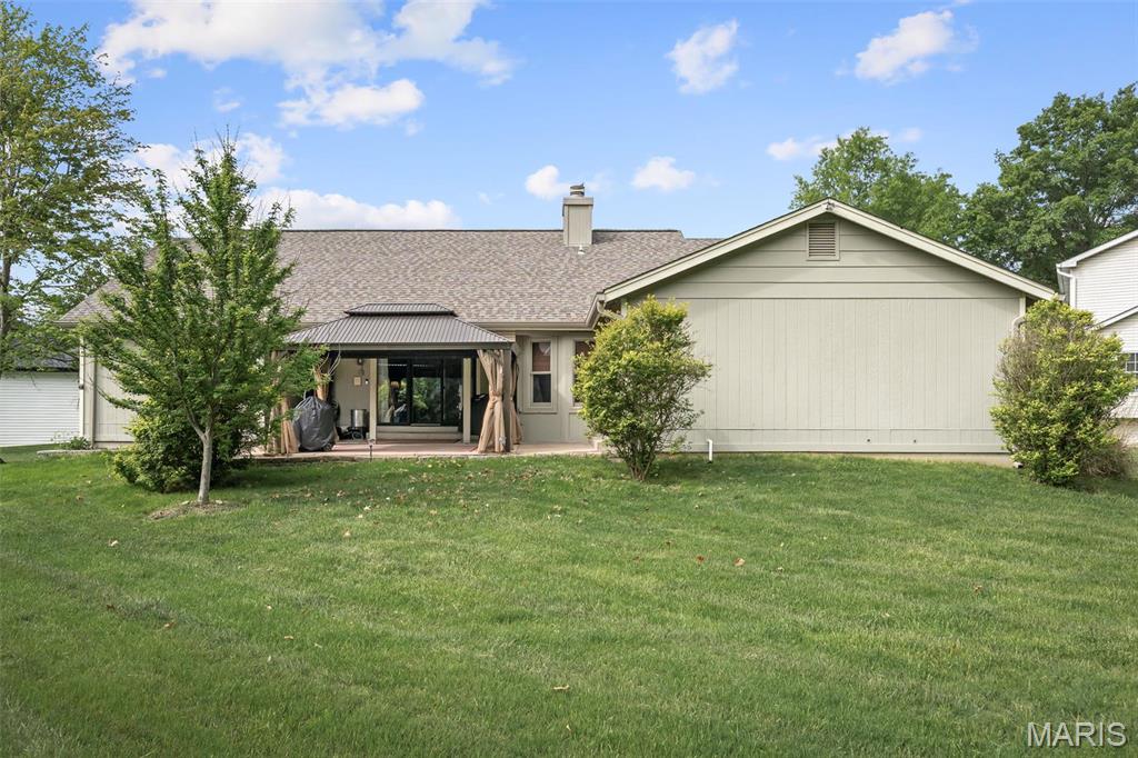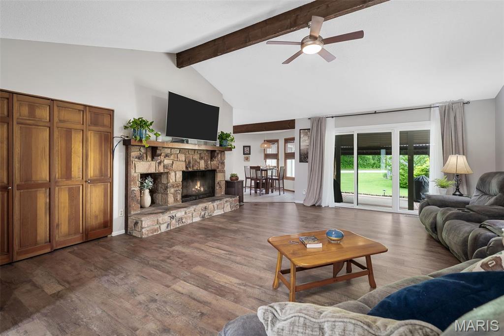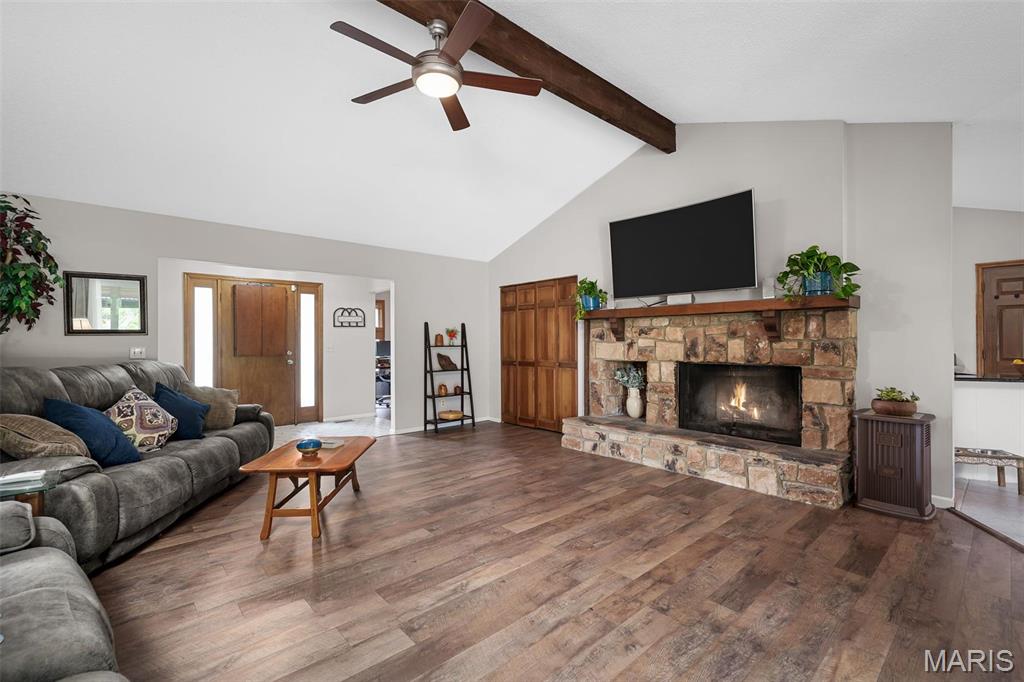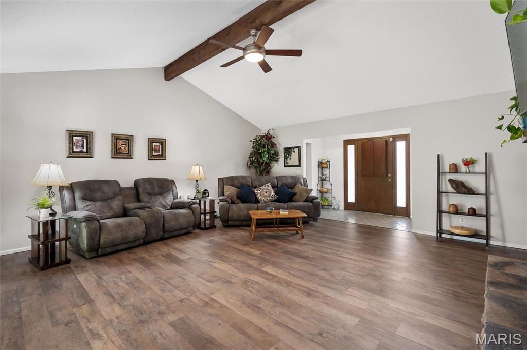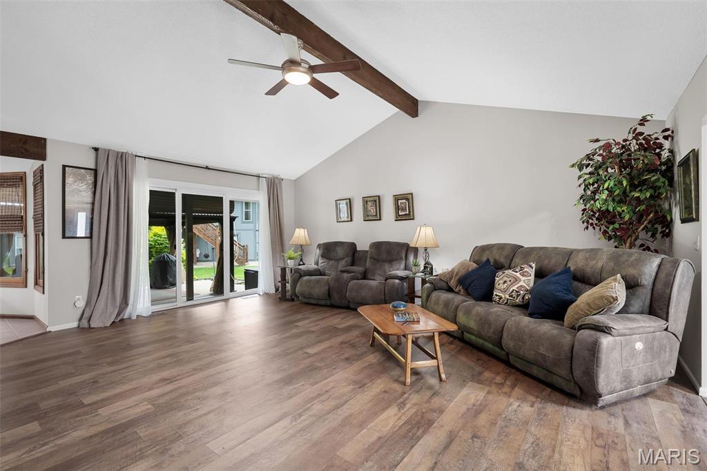 Stop the car! Updated 4 bedroom, 2 bath home tucked away in a quiet cul de sac with lake views. Cozy spacious great room boasts soaring vaulted ceilings w/wood beam & stone fireplace. The galley kitchen features granite counter tops, backsplash, a skylight and SS appliances including the fridge that STAYS. Formal dining room and convenient main floor laundry. 4 spacious bedrooms each with a ceiling fan. The master bedroom has a slider leading out to the patio. The lower level is partially finished and would make a great rec room, exercise area or family room. New premium laminate flooring (2023). New roof, gutters and gutter guards (2024). Some cedar siding replaced (2023). HVAC 7 yrs old. Enjoy all of Lake St Louis's SUPERB amenities including 2 lakes, beach, pool, tennis courts, golf, water sports/clubs & fun year-round events. Easy access to 70 or 40/64. More than a home...it's a lifestyle! See today before the sign reads SOLD!!